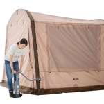 ▲専用ポンプで空気を入れると約70秒で自立。ロープとペグで固定すれば快適なスペースが確保できる
