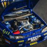▲ボンネットを開けるとそこに鎮座するのはEJ20型の水平対向ターボエンジン。独特のエキマニ形状もしっかり再現