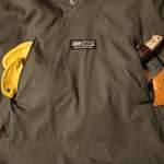 難燃性を持つミリタリーファブリック「BRAZE SHIELD」を使用したアノラック。従来の難燃素材と比べて5倍の強度があり、接炎しても溶融することなく炭化し、自己消火性に優れているのが特徴。火の粉を受けても穴が空きにくいため、焚き火ウエアに最適。