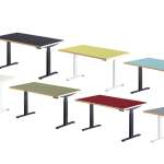 ボタンひとつで好みの高さに調整ができます。天板エッジには、腕への負荷を軽減するなめらかな曲線仕上げのスムースフォルムエッジをラインアップしています。豊富なサイズ展開とカラーバリエーションをとりそろえています(ワークプレイス製品部)