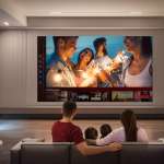 投影距離問題を解決する超短焦点プロジェクター。主要な動画配信アプリが入っていて、HDMI経由でブルーレイレコーダーやゲーム機と接続も可能。部屋によって違う壁色や壁紙の凹凸を自動で補正して投射するので、観る部屋を選ばない。