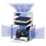 ▲ワイドな吹き出し口の採用と、ファンをフィルターの下部に配置することによる防音効果で、人が感じる運転音に配慮
