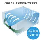 ▲コンパクトな本体サイズながら、最大12立方メートル/分の大風量と、コアンダ効果を応用したスピード循環気流で遠くのホコリもしっかり引き寄せ、パワフルに吸引