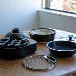 ▲炉端焼きや串焼きができる「焼き網」、ステーキや煮込み料理もできる「深皿」、たこ焼きにも最適な「ボールプレート」、伊賀焼の「土鍋」と「蒸し皿(陶製すのこ)」の5種類が付属する