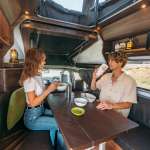 ▲リアのリビングスペースにはベンチシートとテーブルをセット。ルーフトップを上げると開放感があり、とても車内とは思えないほど