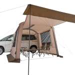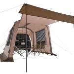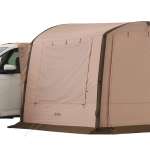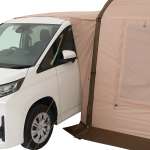 クルマと連結させて、手軽、簡単にリビングスペースを確保できるシェルター。本体は撥水・防水・難燃・紫外線カット加工が施されている。キャンプ場などで基地の規模を広げて、開放感のある時間を過ごせるようになる。
