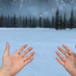 ユーザーの手の位置が正確に映し出される。実世界に在るキーボードでタイピングしたりコップを取ったり、テーブルの角を避けたりできる。