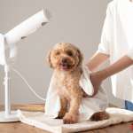 両手が使え、お風呂の後にワンちゃんやネコちゃんの毛を触れ合いながら乾かしてあげられる自立型ドライヤー。ペットたちに最適な約40~55度の優しい温風が噴き出す。