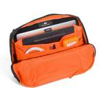 メインスペースは視認性に優れたオレンジを配色。14インチまでのノートPCを収納できるPCポケットに加えて、コードやモバイルバッテリーなどを仕分けできる小ポケットも装備。機能的に収納できる内装になっています。