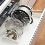 幅30〜54cmに調整できる収納スタンド。ざるやボウル、フライパンなどを立てて収納でき、フライパンの取っ手を上向きにしまえるため出し入れも楽。5本のM字ワイヤーは調理器具のサイズにあわせて位置を変更できる。