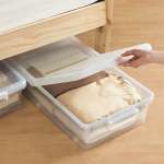ベッド下やソファー下の空きスペースを有効活用できる収納ケース。透明なため中の荷物を把握しやすく、フタは両面開きで取り出しやすい。キャスターは取り外し可能で、縦横どちら向きにも取り付けられる。容量35L