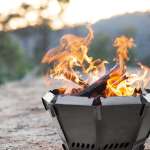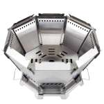 八角形の見た目が個性的な焚き火台。組み合わせる8枚のパーツはそれぞれ二重構造になっており、効率的に空気を循環させることでより高い燃焼効果を実現している。見た目以上に扱いやすく、よく燃えるため初心者でも手軽に焚き火の楽しみが味わえる。