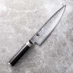 刃渡り200mmの万能包丁。筋や繊維質の多い食材も長めの刃できれいに切ることが可能。硬さの異なるステンレスを重ね合わせた33層構造により、刃体表面にはダマスカス模様が広がっている。鋲を使わず美しく仕上げた積層強化木のD型ハンドルも見逃せない。