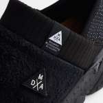 履き口には、足当たりの良いニット素材を使用しており、異素材を組み合わせた深みのあるビジュアルが特徴です。モノトーンで統一されたカラーリングが、無骨さと洗練さを両立。パンツの裾をロールアップして、くるぶしを少し見せるサンダル感覚のコーディネートがおすすめです。