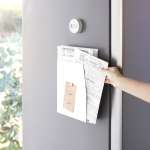郵便物やパンフレットなどをまとめて収納できるスチール製のスリム設計のプリントケース付属のマグネットを本体に貼り付け、浮かせて設置することも可能。縦・横どちら向きでも使える。約W18.5×D4.2×H23.5cm。