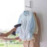 衣類スチーマーをサッと使える折り畳み式のドアハンガー。ドアに引っ掛けて固定するだけの簡単取り付けで、ハンガー部の高さを4段階から選べる。翌朝に着るシャツやジャケットの一時掛けにも活躍。長さ約54.5cm。