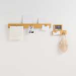 付属のピンで簡単に取り付けられる壁面収納アイテム。本体上部に溝があり、雑誌やCDを立て掛けたりハンガーを引っ掛けたりできる。板面にマグネットが付くため写真等もディスプレイ可能。幅約30~88cmの3種展開。