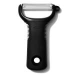 太めで平らなグリップが手にフィットするY型ピーラー。グリップはソフトで滑りにくく、側面のフィンが指の力を吸収するため、長時間使用しても手が痛くなりにくい。刃幅が広いステンレススチール刃は切れ味抜群。