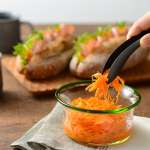 特許取得のバネ構造で、柔らかな使い心地を実現したミニトング。卓上でおかずを取り分ける際に重宝する。先端は隙間なく閉じるため、口の狭い瓶詰めからも取りやすい。梅干しを潰さず掴めて、らっきょうも一発キャッチ。