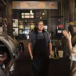 ▲名物テキサスバーベキューの美味しさの秘密を店員さんに取材中