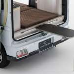 ベッドスペースとして使えるポップアップルーフを備えた広い居住空間が魅力の軽キャン。乗り心地の良さとベッド下に広い収納を持つ「F1タイプ」は、車中泊だけでなくテレワークなどのビジネスシーンにも対応する。