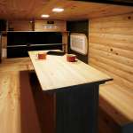 広々とした室内にシンプルで美しい家具を配置。また車外にあるステンレス製排水タンクは驚きの使いやすさ!(渡辺さん)