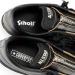 アメリカの老舗ブランド・ショットとのコラボした一足。ショットのライダースジャケットの代名詞でもある、通称「ワンスター」とコンバースの「ワンスター」それぞれのデザインディテールが融合しており、履き込むことで表情が変わるエイジングレザーが好印象だ。