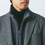 上級編では、ユニクロのルックにも登場する「アウター×アウター」の重ね着に挑戦。ウール素材のセットアップにフリース素材のスタンドカラージャケット、さらにタートルネックのニットをレイヤードするという大胆なスタイリングだが、全体を濃いめのグレーで統一することで違和感なく仕上がっている。