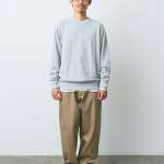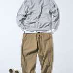 主役となるトップスは、カジュアルの定番として擦られまくったグレーのクルーネックスウェット。対する相方のボトムスには新鮮味のあるワイドシルエットのチノパンツを選択。