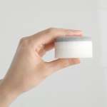 洗面台まわりに吸盤で取り付けられるスポンジ。浮かせて収納すると乾きが早く衛生的。直径約6cmのコンパクトサイズなので、洗面台に可愛らしく佇む。手に取りやすいから、立ったついでに掃除ができて綺麗を保ちやすい。