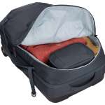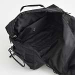 どこに入れたっけ?で空港や出発前にバタバタするなら、シンプル&スマート設計のダッフルバッグをチョイス。センターオープンなら左右にガバッ、フロントオープンなら向かって右側のメッシュ側だけ開けるので、出し入れが多いものはこちらに収納を。メッシュの仕切り版は折りたたみ式でくるっと丸めて留められます。サイドハンドルは磁石入りでパチっとくっ付くなど細かな配慮も。素材は800Dナイロンで耐水加工済みです。荷物が少なめの時は外側のコンプレッションストラップでギュッと閉めれば全体サイズも縮小します。