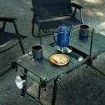 定番の薄型バーナーやカセットコンロもセットできる便利なアイテム。凹凸のある斜面サイトでも、4mm単位での高さ調節機能を使って安定したテーブル面を確保できる。付属の専用収納ケースに入れれば持ち運びもコンパクト。入荷の際にはぜひ手に入れたい人気ギアだ。