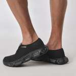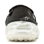 可動式ヒールユニットでカカトを潰して履いてもペタペタしすぎずに快適に動き回れるのがポイント。100%リサイクルP.E.T.を採用したメッシュアッパーは通気性もよく、ほどよい伸縮性があります。ソール部分には約2mmに設定された凸凹があり、直接地べたを歩いたときのような疲労もありません。取り外しできるインターナルフットベッドはふんわり心地よく、靴下を履いたままでも裸足でも使えます。甲とカカトにループが付いているので、ちょっとした場所に掛けておくことも。