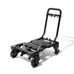 二輪・四輪モードと薄さ130mmの収納形状に変形できる台車。二輪では小回りが効き、四輪では大型の荷物の運搬が容易だ。キャンプギアの積み込みや運搬にも便利。耐荷重は二輪時70kg、四輪時120kg、本体重量は7.4kg。
