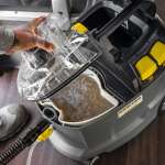 ソファーやカーペットなどの布製品を洗浄する、同社業務用カーペットリンスクリーナー。フロアツールを寝かせた状態でも、常に吸引口が接地するフレキシブルなノズルを採用。ハンドノズルの使用で、布張りソファーや椅子にも対応できる。