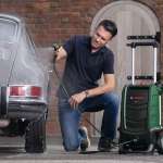 同ブランド製のバッテリーパックを接続して使える高圧洗浄機。15Lのタンクを内蔵しており、キャスター付きなので小回りが利いて狭い駐車スペースでも洗車がしやすい。水圧も調整ができるので、バイクや自転車にも使える。