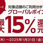 ▲2025年1月31日まで、特定店舗のポイント還元5.5%に条件達成特典分の最大9.5%を上乗せした最大15%還元企画を実施中