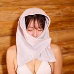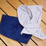 頭巾風にかぶったり、目元や口元を覆ったりと、1枚で多様な使い方ができるサウナハットタオル。スナップボタン付きで形状が安定し、ずり落ちてきにくい点も◎。「髪を熱から守りたいから、しっかり覆える長さがあるのはうれしい。熱さが苦手な初心者さんはもちろん、荷物を減らしたい人にもおすすめです」(麻衣ちゃん)