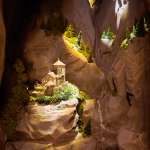 ゴツゴツとした岩肌を再現した水風呂の空間は、本物と見紛うほど凝ったつくり。プロジェクションマッピングチームが照明を手がけたジオラマも、幻想的な雰囲気を後押ししている。