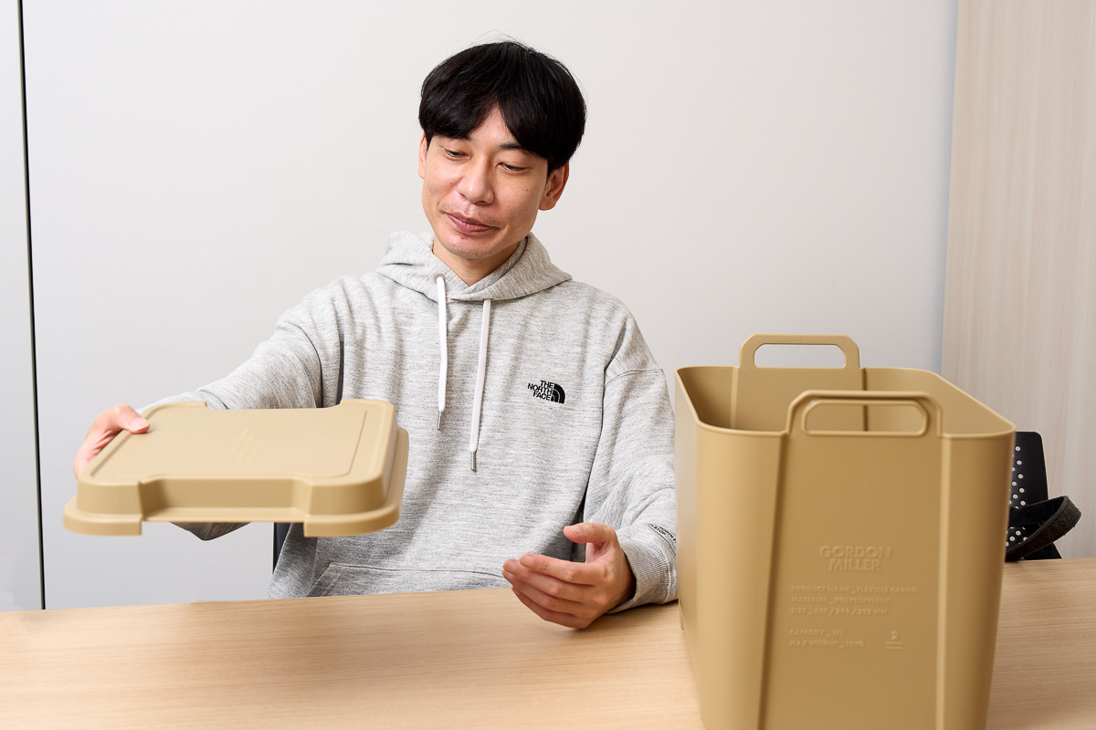 板倉さん(以下敬称略):これ一度3Dプリンターで作ろうかと思ったくらいのやつなんですけど…。(「フレキシブルカーゴ 18L」を手に取りながら)この形状のコンテナってすごい便利なんですよね。僕もハイエースの下段に積んでいて、トースターを入れたりしているんです。それでトースターをコンテナの上に置いて使いたい時、当然フタを開けますけど、そのフタを一旦置いて、中身を出して、またフタを戻して…。じゃなくて、もともとフタに脚がついていればそのままテーブルとして使えて効率がいいんじゃないかとずっと思っているんですよ。