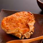 甲羅の器に、蟹身だけでなく内子・外子までせいこ蟹を丸ごと1杯分詰め込んだ、なんとも贅沢すぎるグラタン。素材の味を生かすために調味料も添加物も一切使用していないので、大人から子供まで安心して楽しめる。