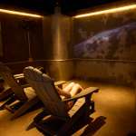 サウナ室横に6脚のイスが置かれた広めの内気浴スペースも。壁に映し出された地球やオーロラの映像を見ながら“チルタイム”が過ごせる。