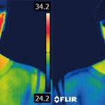 ▲高音モード(46度)で首元に装着すると40秒後にはしっかりと温まり温かさが広がる。写真左:装着後、右:装着前