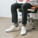 パンツとソックスの色を合わせると、脚のラインが自然につながり、すっきりとした印象に。たとえば白スニーカーのようなカジュアルな靴でも、パンツとソックスに統一感があれば、全体が上品にまとまります。