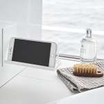入浴中にスマホを正面に向けて見られるスタンド。接地面にシリコンクッションが付いており、スマホが滑りづらく水はけの良い構造。16.5cmまでのスマートフォンに対応。