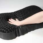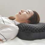 ▲驚くほど柔らかな“TPE”と三角格子構造の組み合わせで広範囲に圧力分散され、頭、首、肩までフィットする