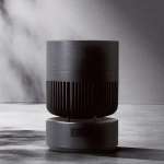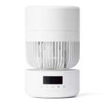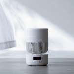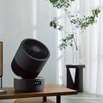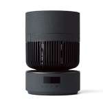 使用中に電源を切ると上の写真のように円柱型の状態に戻って停止。グレーのモデルはファブリック調の質感なのでリビングや寝室の雰囲気を損なわない。マグネット搭載のリモコンも付属。