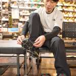チェーンスパイク(滑り止め)は靴との相性も大事。板倉さんも愛用のブラックダイヤモンド「アクセススパイク トラクションディバイス」を持参してフィット感を確かめた。