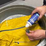 つけ込み専用の撥水剤。洗濯後、撥水剤を入れた水にウエアを浸すことで一度に複数のウエアをムラなく撥水加工できる。乾燥後の熱処理も忘れずに。