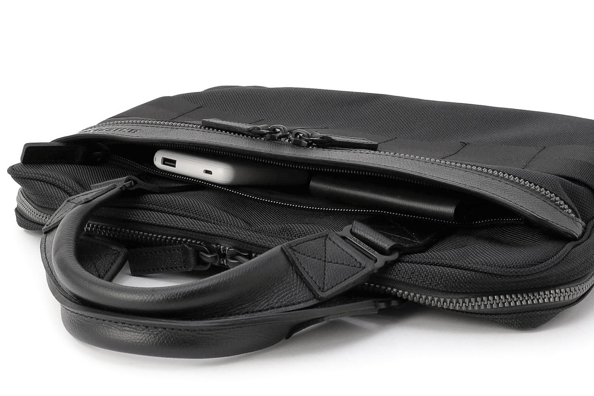 ミニマム化が進むライフスタイルにフィットするコンパクトなバッグ。見た目に反して13インチ程度のPCも収納できる。型押しレザーには防水加工が施され、急な天候の変化に対応可能とビジネス使いにも最適だ。